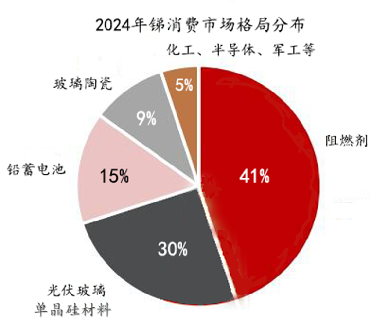 ?產量受限:2024年中國金屬銻產量7.2萬噸,同比-10.3%,產能利用率33%,受制于原料供應不足。2024年需求量為9.71萬噸。主要是光伏系統及阻燃材料的發展,對金屬銻的需求擴大。 ??